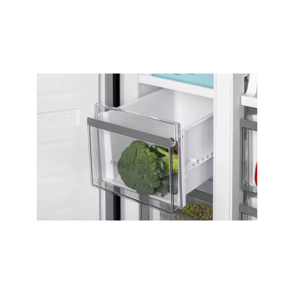 Также в модели имеется ящик с индивидуальной зоной охлаждения, в котором можно установить свою необходимую температуру — 0 °С или -3°С (при общей температуре холодильного отделения от 2 до 9 °С ).