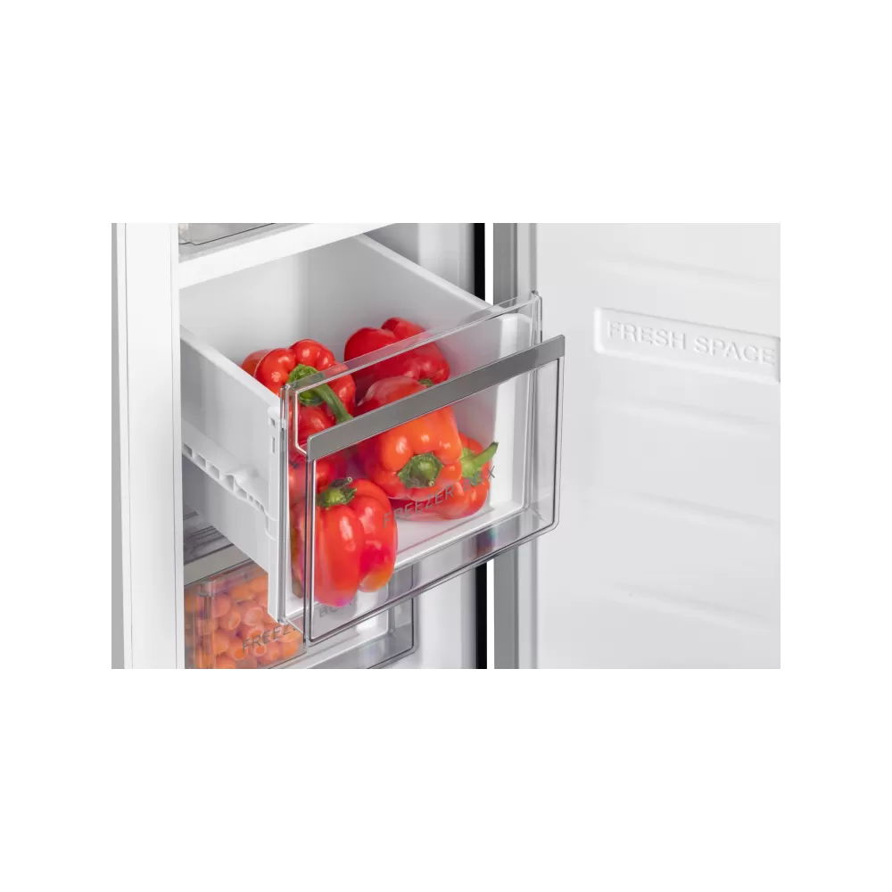 Глубина холодильника 60 см позволяет свободно встроить его в кухонный гарнитур. При этом необходимо обеспечить всего 6 мм минимального расстояния от техники до кухонных шкафов. В модели предусмотрена система нижнего отвода тепла, за счет которой стенки соседних шкафов не будут нагреваться. Благодаря обновленной дверной конструкции и специальным петлям двери холодильника открываются на 90 градусов, обеспечивая удобный доступ к продуктам.