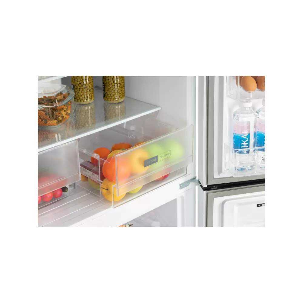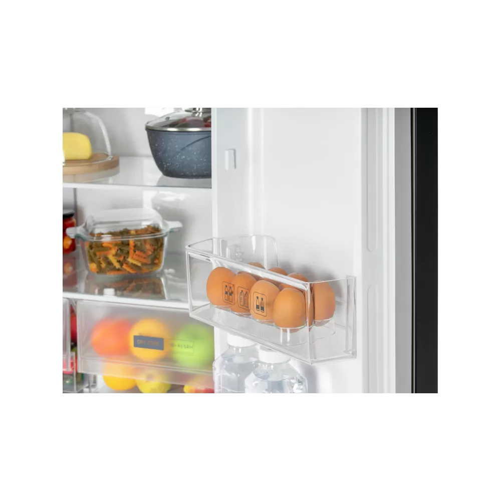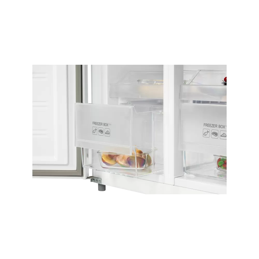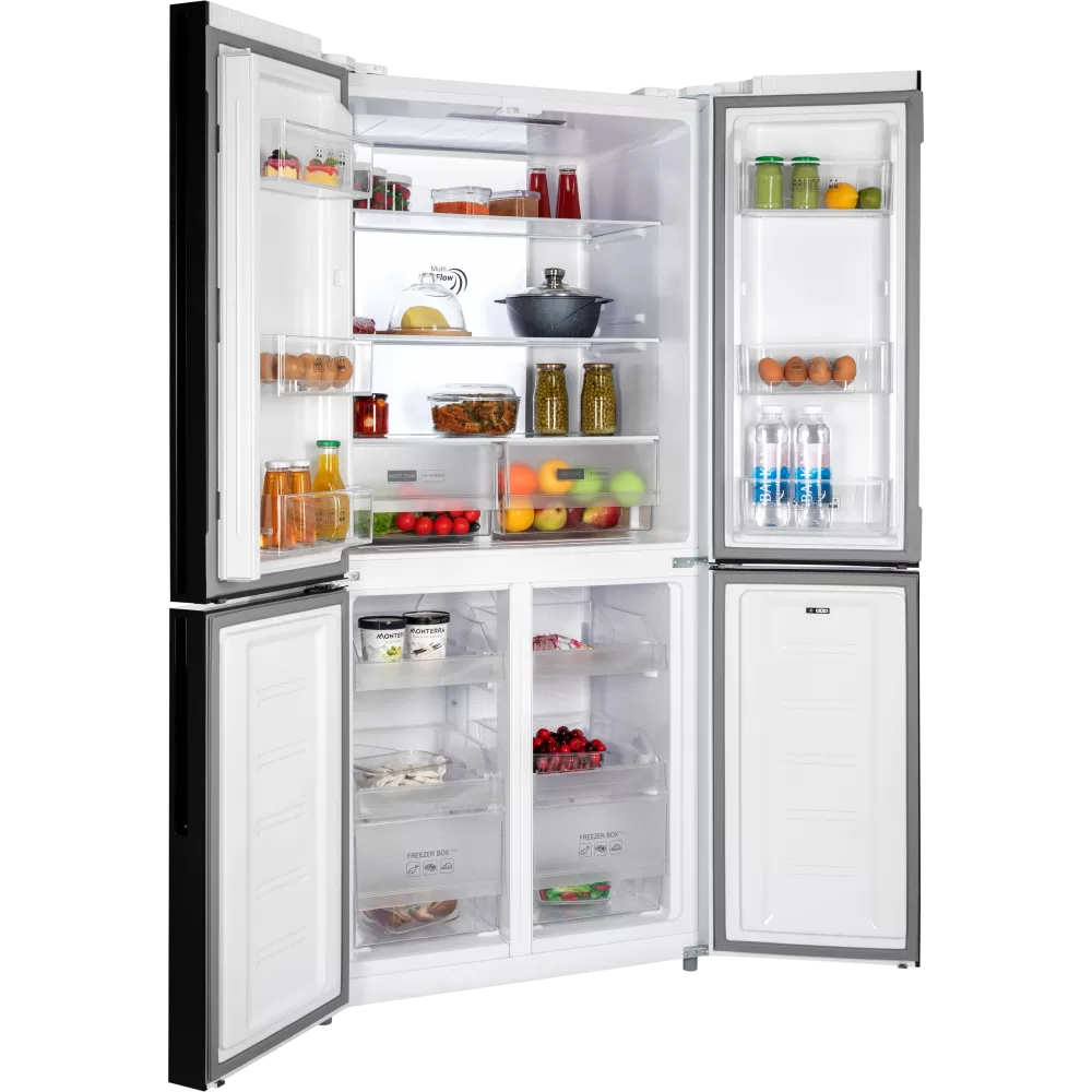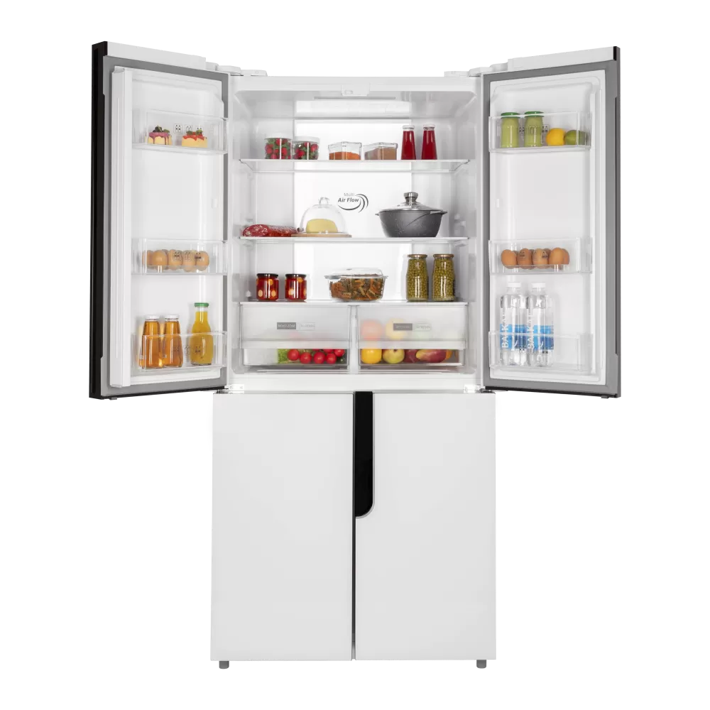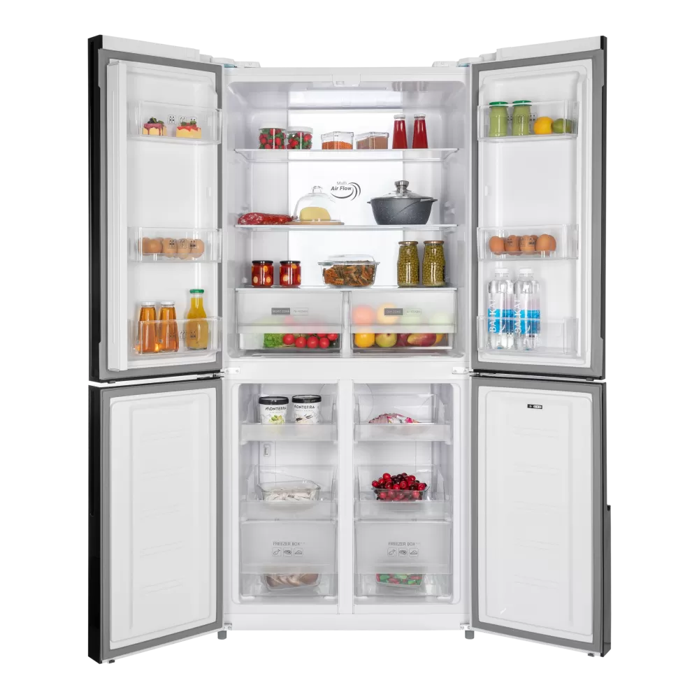 4-х дверный холодильник имеет единое пространство верхних полок холодильной камеры, чтобы удобно было размещать габаритные кастрюли и контейнеры. Прочные полки из закаленного стекла можно регулировать по высоте, а ящики в холодильной камере предназначены для хранения овощей и фруктов и оснащены влажной зоной свежести и сухой.