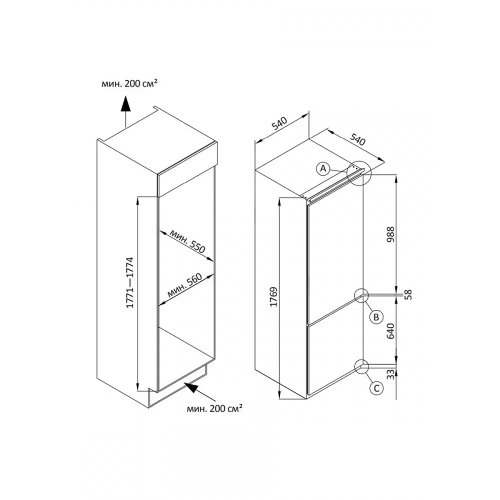 Габариты холодильника 540 х 540 х 1769 мм – это идеальные параметры для встраиваемой модели, создающие вместительное и функциональное устройство, удобное в установке и не занимающее много места на кухне. Возможность перенавесить двери на удобную сторону для открывания позволит установить холодильник в любом месте.