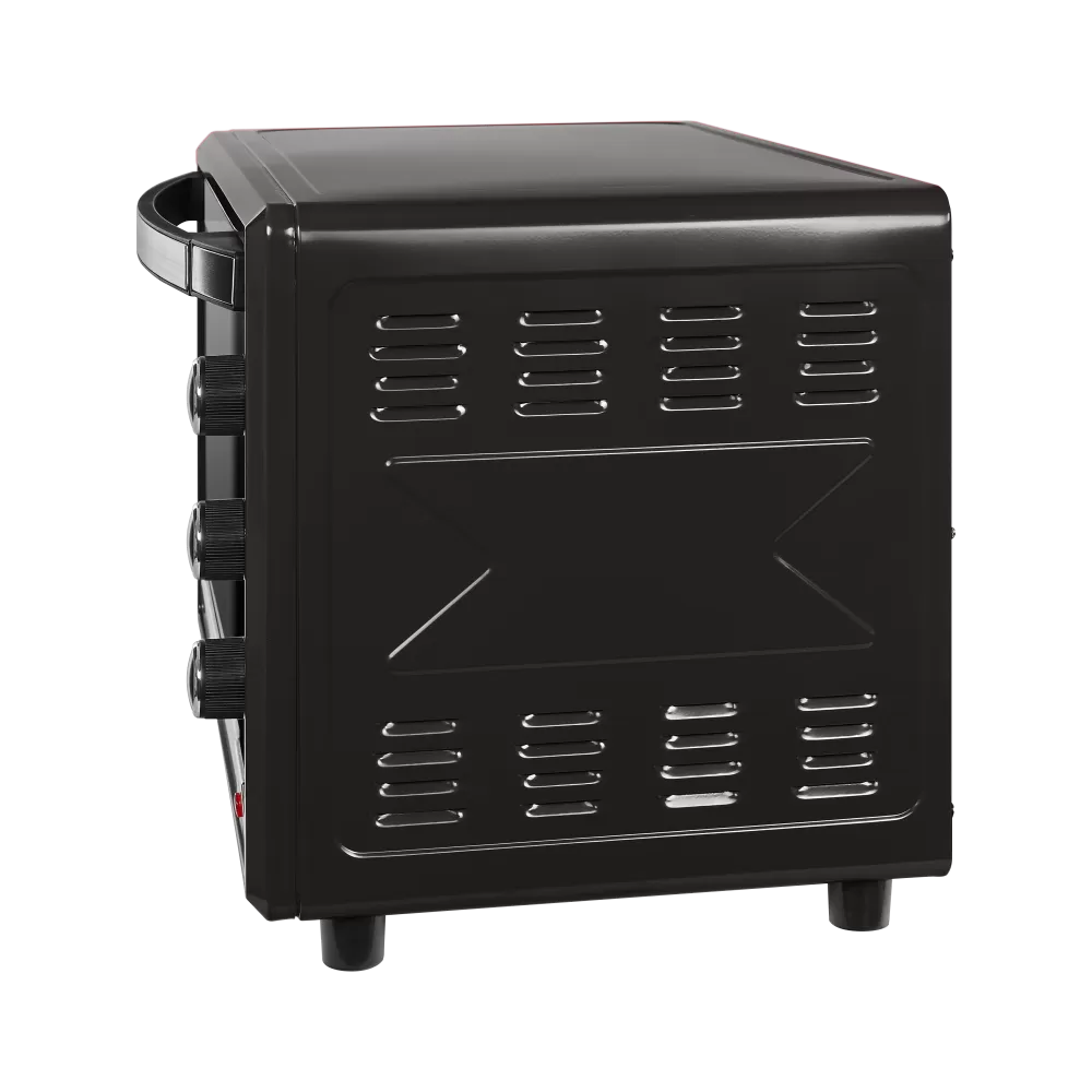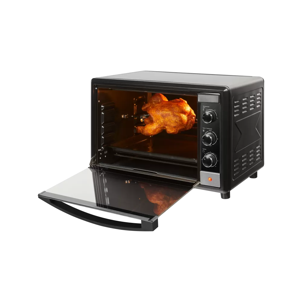 Механическое управление настольной духовкой интуитивно понятное, осуществляется посредством регуляторов. Температура нагрева печи от 100 до 250 °С.