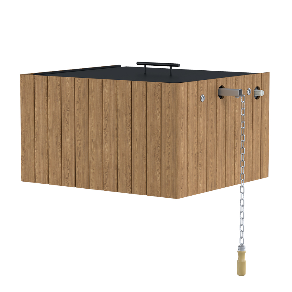 Обливное устройство ЭВЕРЕСТ представляет собой бак из нержавеющей стали, автоматически наполняемый водой. Количество воды в баке регулируется с помощью клапана подачи воды. Максимальный объём воды в баке – 35 литра.Бак обливного устройства устанавливается на высоте 2-2,2 метра. Вода для облива после парилки подаётся с помощью рукоятки на цепи. Широкое основание бака с большим количеством мелких отверстий обеспечивает оптимальный по размеру и интенсивности поток воды.Равномерная подача большого объёма воды обеспечена за счёт трех выпускных клапанов, одновременно открывающихся при потягивании рукоятки вниз.