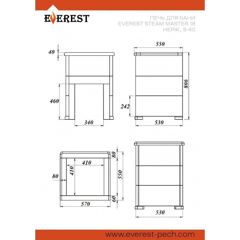 Печь для бани Эверест "Steam Master 18 INOX" Талькохлорит, S-40 изготовлена из нержавеющей стали. Печь предназначена для установки в частные и коммерческие бани с объёмами парных помещений до 18 м³.
