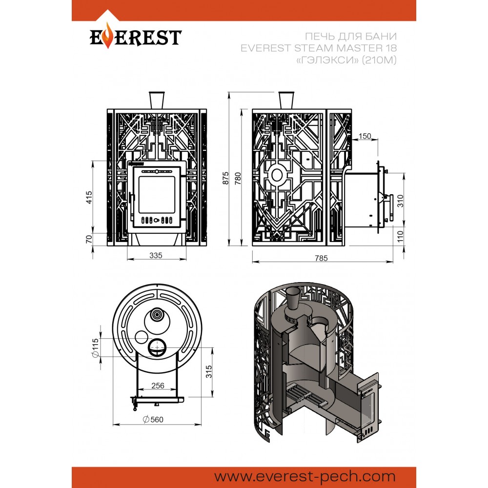 Серия: EVEREST Steam Master Объём парного помещения: от 8 до 18 м3 Ширина: 560 мм Высота: 780 мм Глубина: 785 мм Материал дверки: Особо прочная котловая сталь 09Г2С Вес: 68 кг Тип каменки: Открытая//Закрытая Материал закрытой каменки: Нержавеющая сталь (AISI 430) Толщина закрытой каменки : 4 мм Материал топки: Нержавеющая сталь (AISI 430) Толщина топки: 3 мм Длина топки: 355 мм Длина топочного тоннеля: 255 мм Диаметр дымохода: 115 мм Топочный тоннель: С выносом Тип конвектора: Сетка GALAXY GOLD Вес камней в конвекторе: 100 кг Вес камней в закрытой каменке: 15 кг Модель дверки: Везувий 210 "М" Размер топочной дверки наружный: 415х335 мм