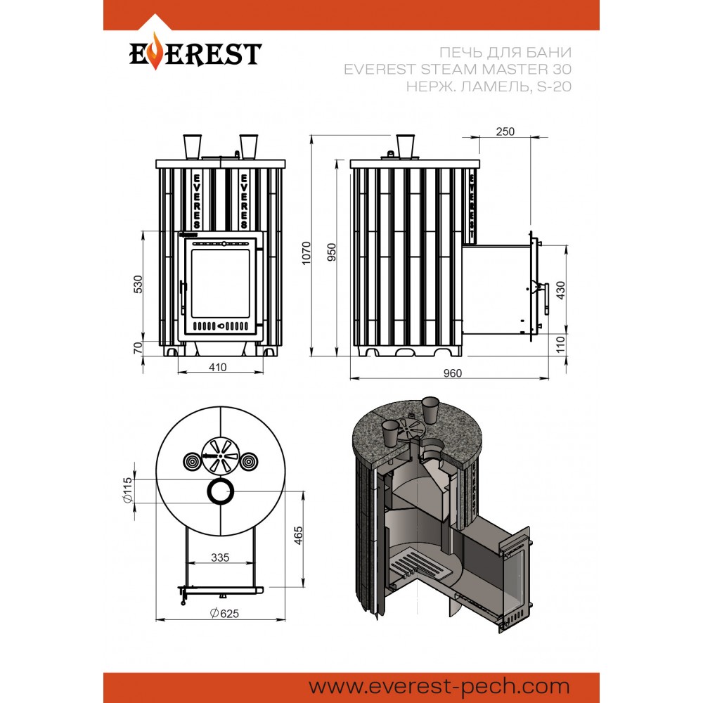 Печь для бани EVEREST "Steam Master 30 INOX" Ламель Талькохлорит, S-20 изготовлена из нержавеющей стали. Печь предназначена для установки в частные и коммерческие бани с объёмами парных помещений до 30 м³.