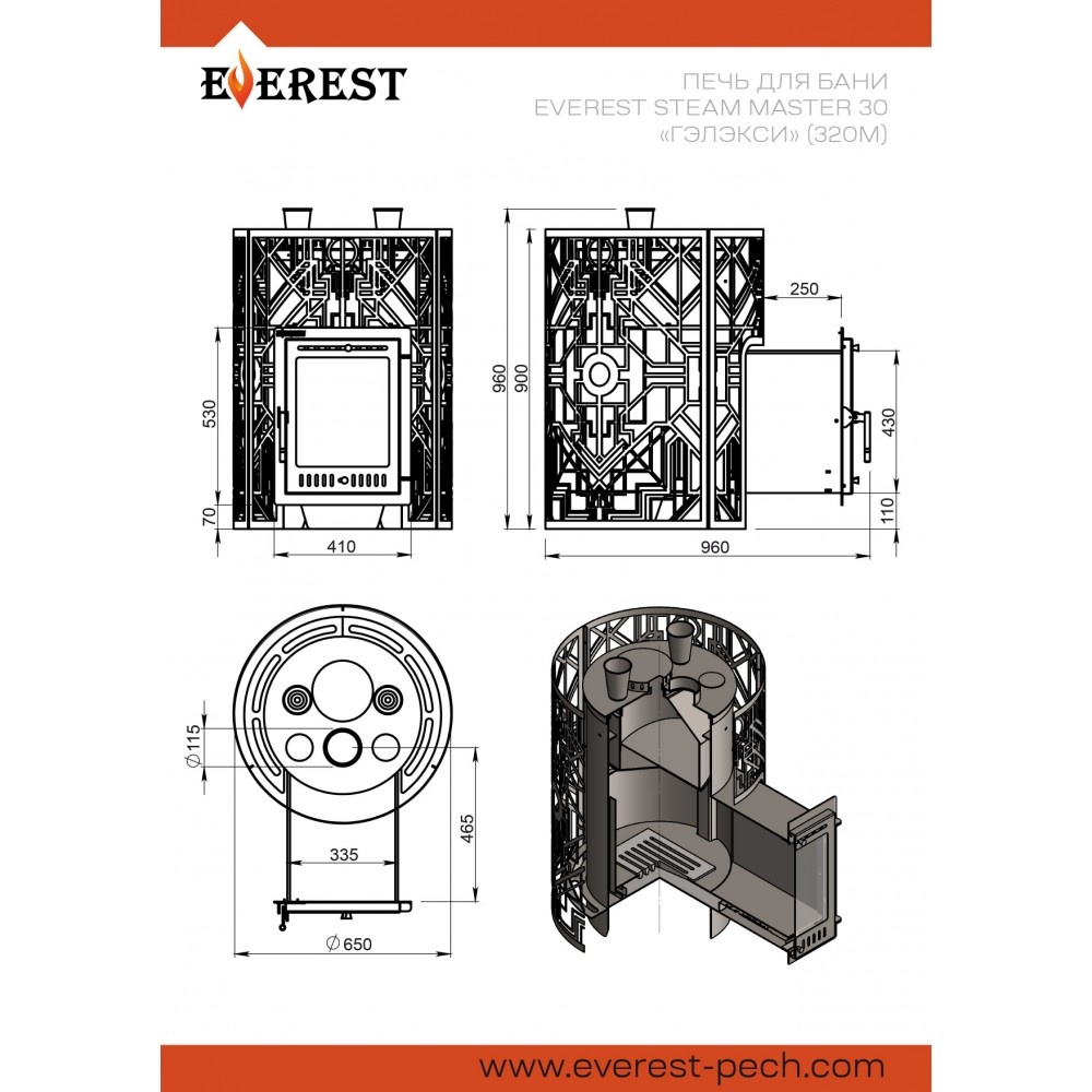 Серия: EVEREST Steam Master Объём парного помещения: от 16 до 30 м3 Ширина: 650 мм Высота: 900 мм Глубина: 960 мм Материал дверки: Особо прочная котловая сталь 09Г2С Вес: 115 кг Тип каменки: Открытая//Закрытая Материал закрытой каменки: Нержавеющая сталь (AISI 430) Толщина закрытой каменки : 4 мм Материал топки: Нержавеющая сталь (AISI 430) Толщина топки: 4 мм Длина топки: 440 мм Длина топочного тоннеля: 340 мм Диаметр дымохода: 115 мм Топочный тоннель: С выносом Тип конвектора: Сетка GALAXY GOLD Вес камней в конвекторе: 140 кг Вес камней в закрытой каменке: 25 кг Модель дверки: Везувий 320 "М" Размер топочной дверки наружный: 410х530 мм