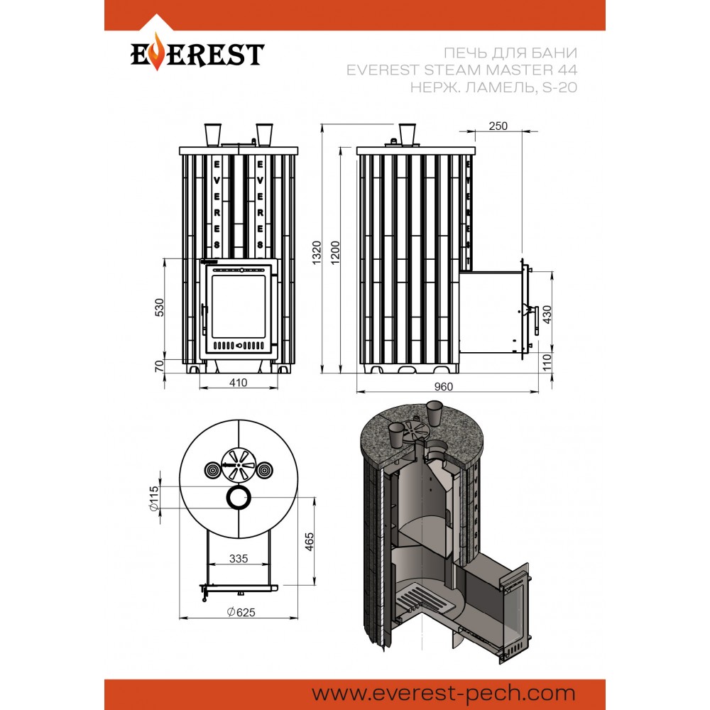Печь для бани Эверест "Steam Master 44 INOX" Ламель Талькохлорит, S-20 изготовлена из нержавеющей стали. Печь предназначена для установки в частные и коммерческие бани с объёмами парных помещений до 44 м³.