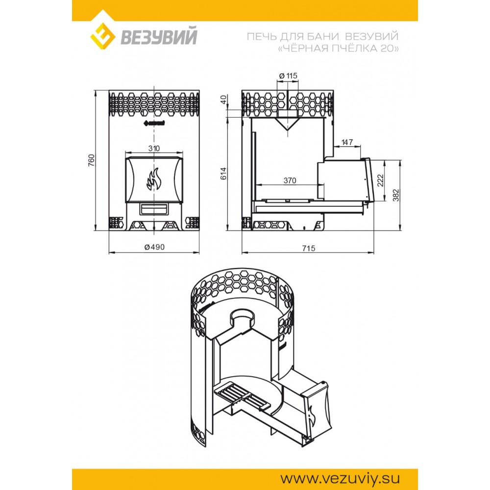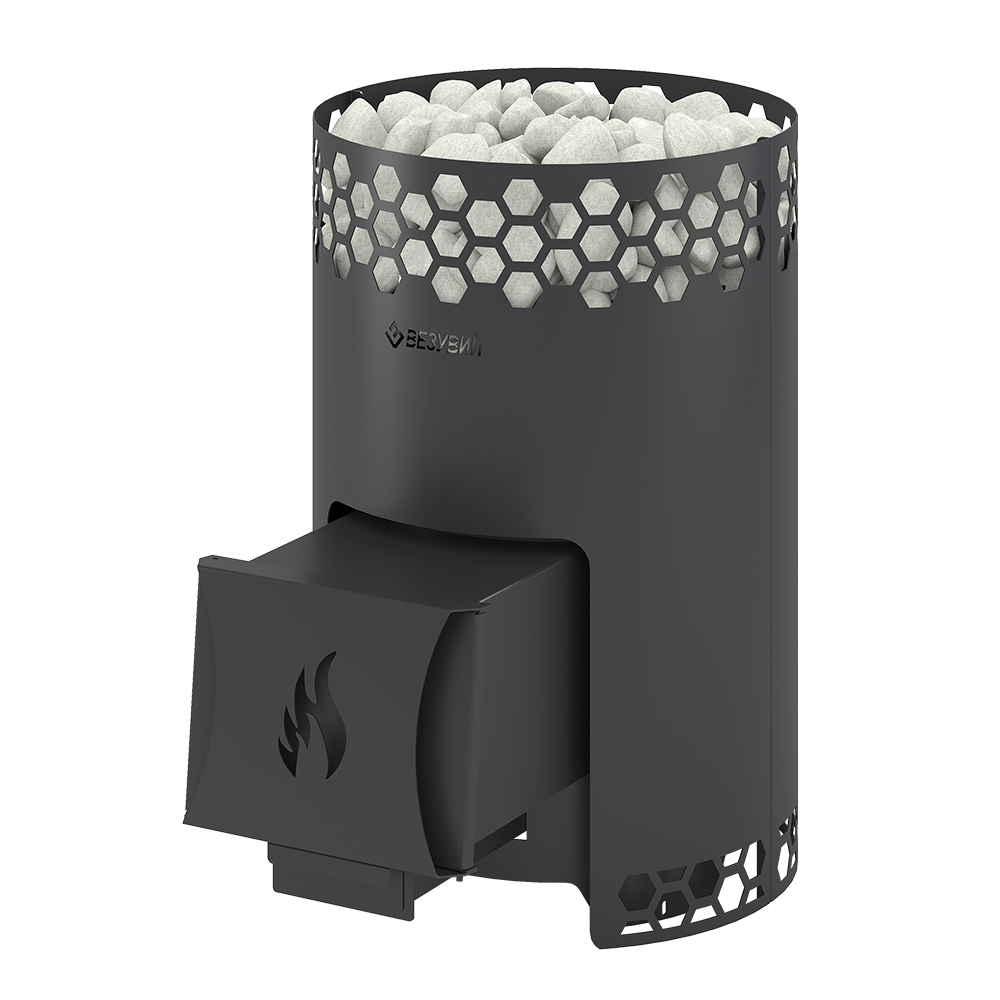 Печь сделана из особо прочной котловой стали марки 09Г2С с толщиной стенок от 3 до 4 мм. Дизайн корпуса печи выполнен в виде сот. Диаметр дымохода 115 мм. Дверка имеет правое и левое открытие. Улучшенная загрузка дров благодаря расположению двери под углом. Печи представлены как со стеклом, так и без него. Так же есть возможность дополнить печь баком на 50 литров, подиумом высотой в 70 мм и фронтальным экраном.