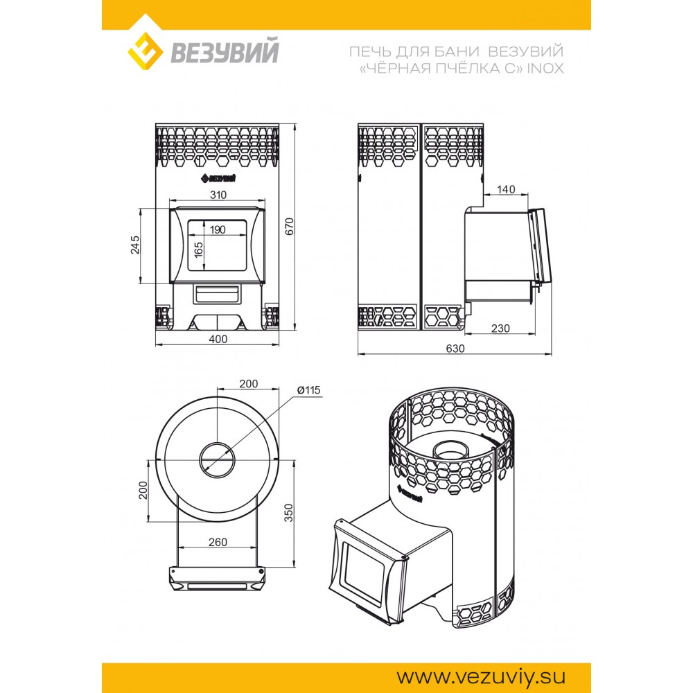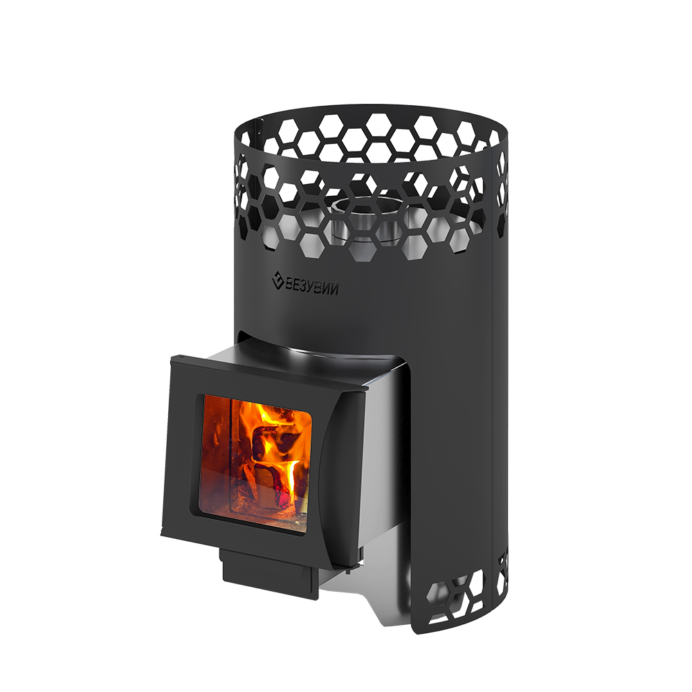 Печь сделана из нержавеющей стали AISI 430 с толщиной стенок от 3 до 4 мм. Дизайн корпуса печи выполнен в виде сот. Диаметр дымохода 115 мм. Дверка имеет правое и левое открытие. Улучшенная загрузка дров благодаря расположению двери под углом. Печи представлены как со стеклом, так и без него. Так же есть возможность дополнить печь баком на 50 литров, подиумом высотой в 70 мм и фронтальным экраном.