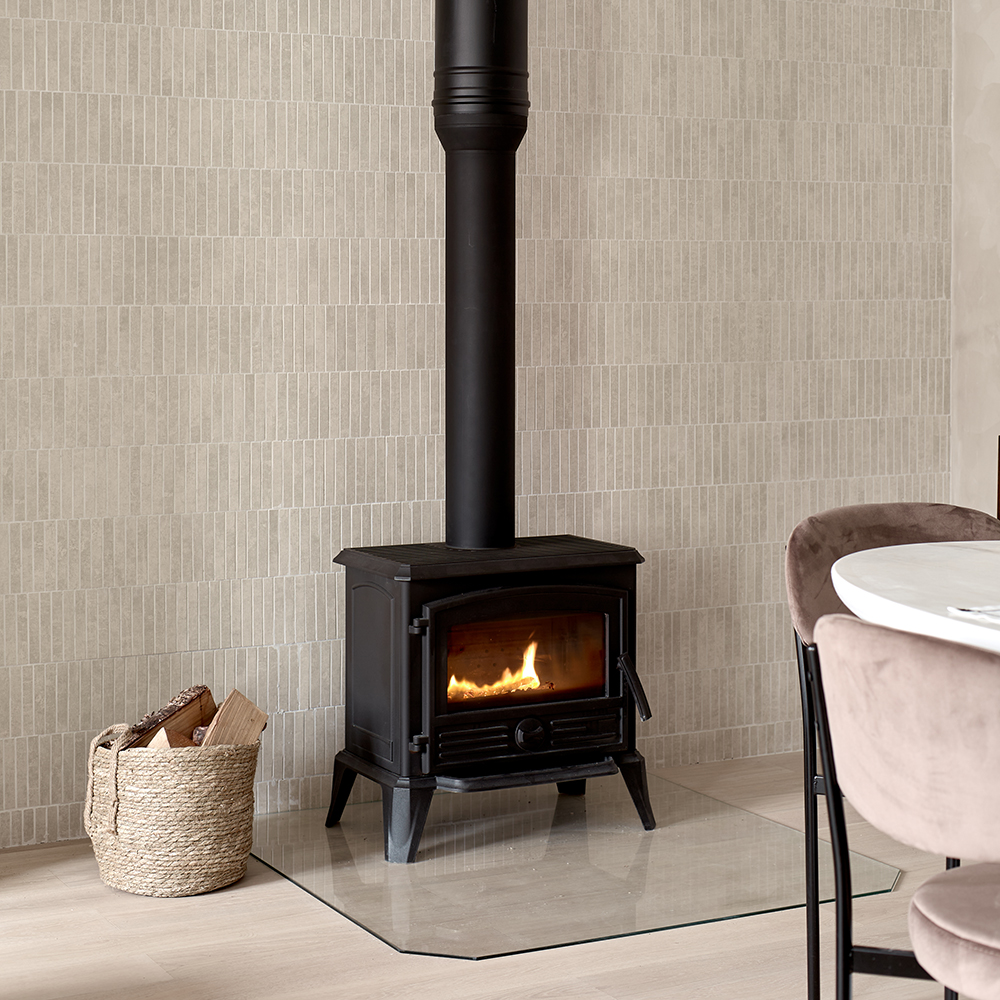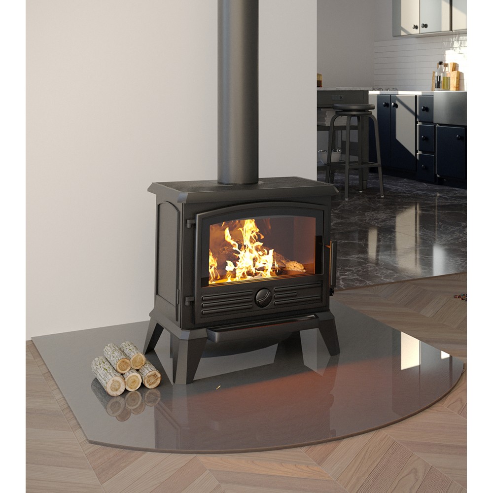 Большое стекло позволяет быстро согреться почти сразу после начала горения дров. Лучистое тепло проходит через всю площадь стекла и перед камином становится тепло буквально через 5-7 минут после начала растопки.