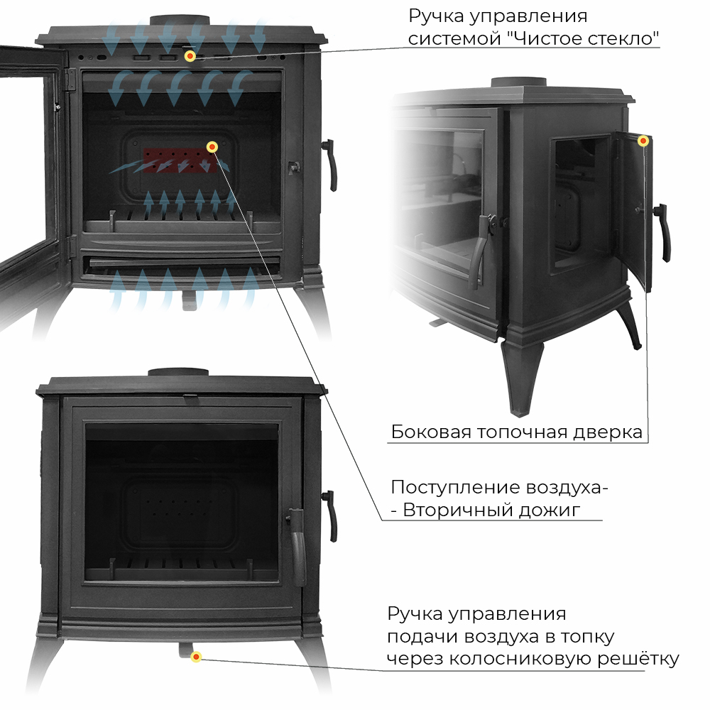 Подача воздуха в топочную камеру осуществляется с помощью заслонки, что позволяет регулировать режим горения. Подача воздуха для вторичного дожига дымовых газов повышает КПД печи и позволяет снять с печи максиму энергии для отопления помещения. Система «чистое стекло» предотвращает засаживание и копчение стекла при горении дров.