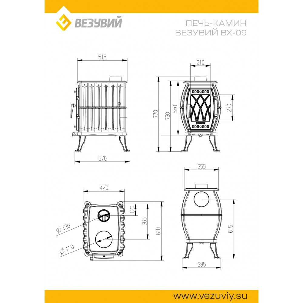 Печь-камин Везувий ВХ-09 "Антрацит" изготовлена из качественного жаростойкого чугуна с толщиной стенок 6-8 мм. Модель рассчитана на обогрев помещений объёмом до 180 м³. Печь-камин имеет пламегаситель изготовлен из чугуна. В Топки печи-камина установлена система двухуровневого вторичного дожига. С помощью этой функции по специальному каналу поступает воздух, который нагревается при прохождении между топочной камерой и задней стенкой корпуса. Далее нагретый воздух через дефлектор поступает в топку, перемешивается с газами - продуктами горения, чем вызывает повторное возгорание. Регулировка этой системы, осуществляется заслонкой, расположенной в нижней части печи-камина. Регулировка подачи воздуха в колосниковую зону осуществляется заслонкой, расположенной в нижней части двери. В верхней части двери расположена ручка регулировки системы чистое стекло, которая помогает оставаться стеклу чистым. Патрубок дымохода Ø 120 мм – универсальный, со сменным положением.